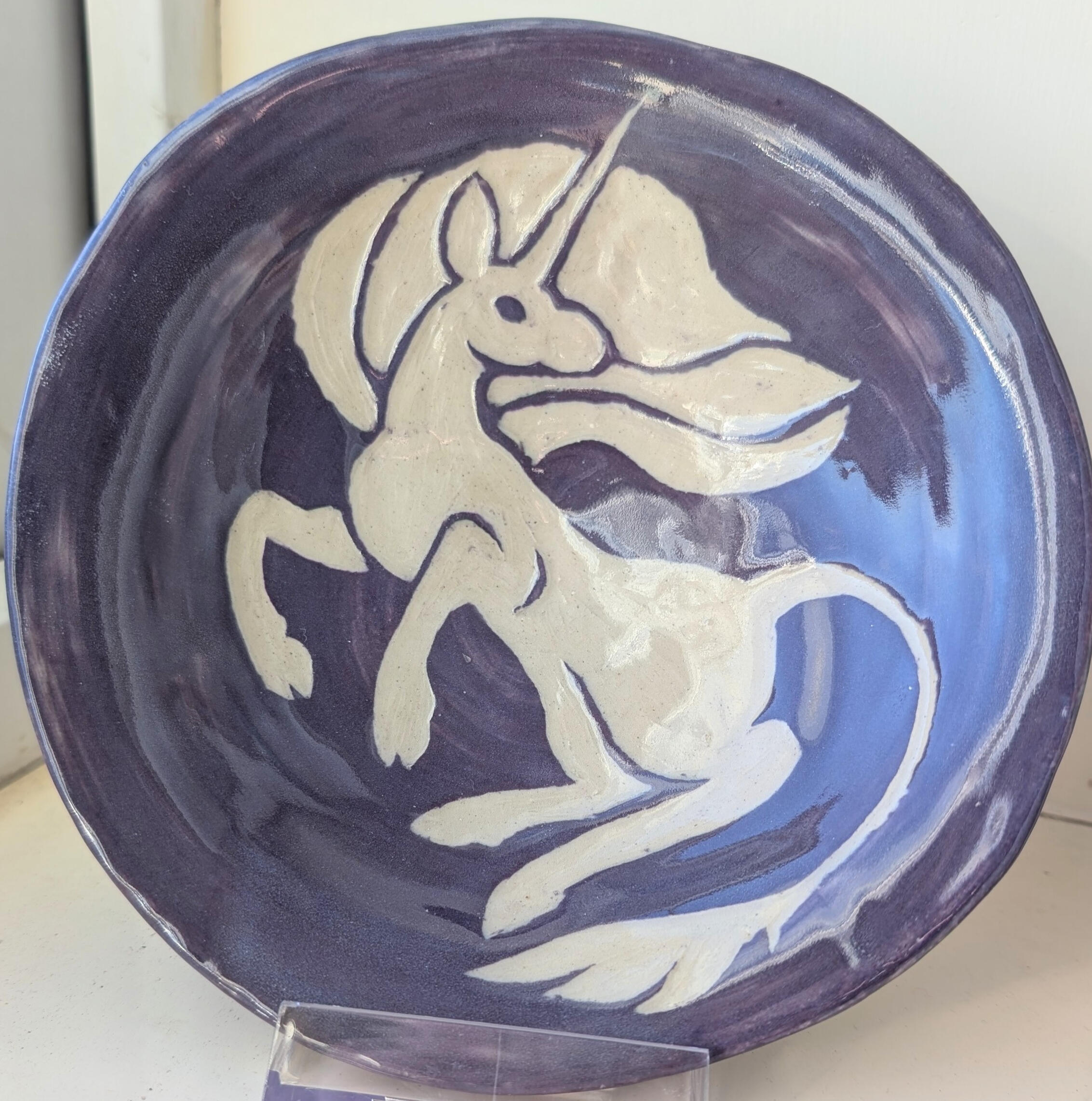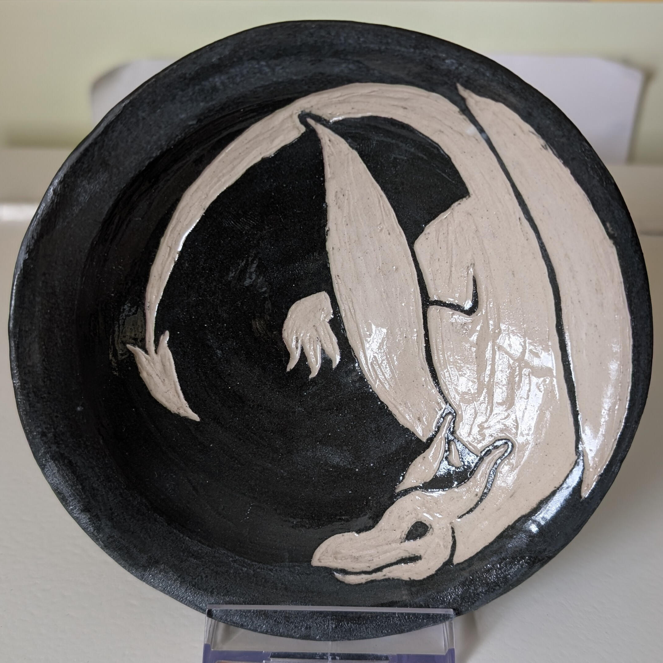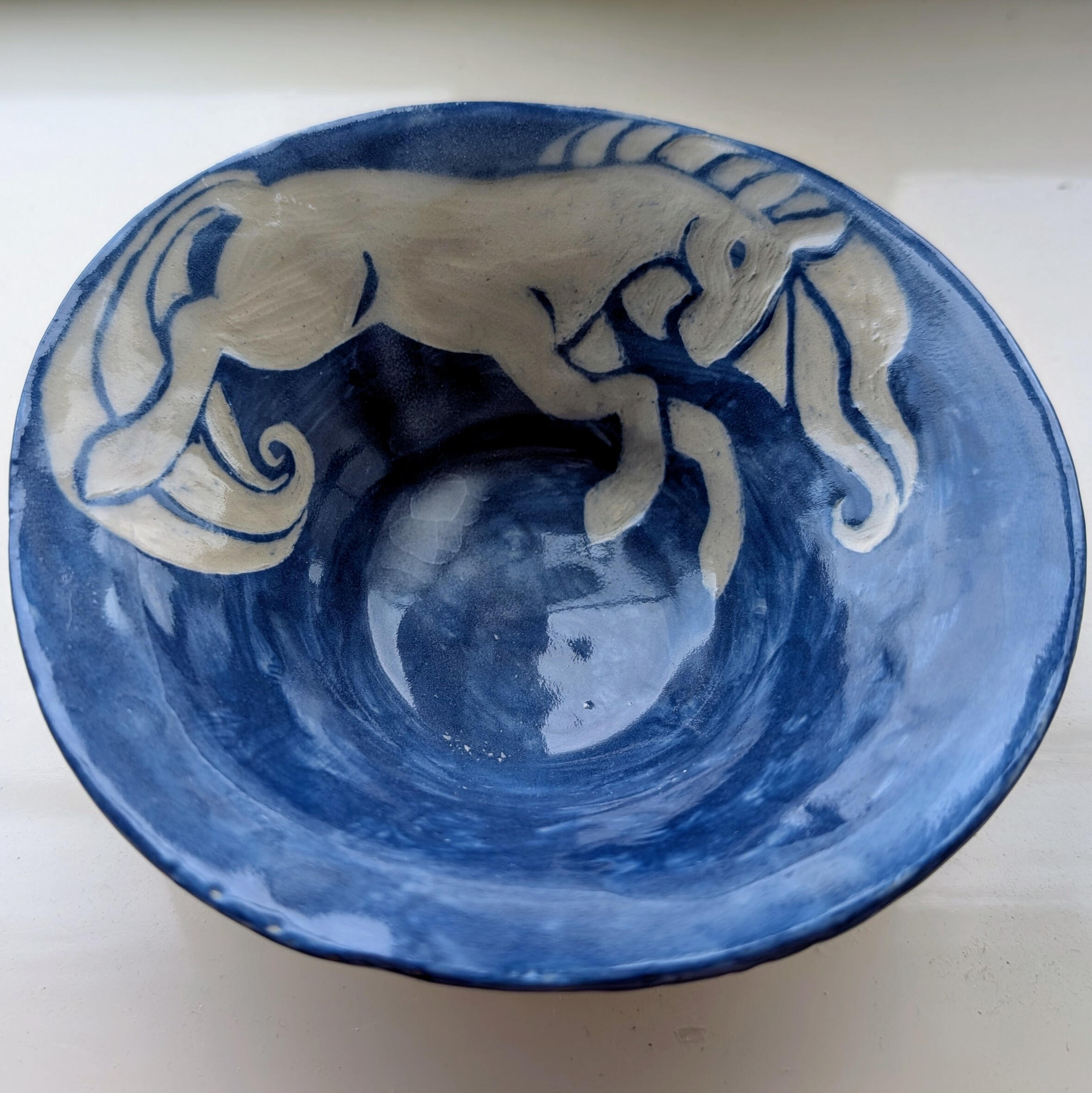 My name is Sarah Huxley and I'm a potter living in Flintshire, North Wales. I started making ceramics after becoming chronically ill; I had to give up my dream of working in the games industry, but I couldn't abandon art.I started taking pottery classes in January 2025 and quickly fell in love. I work with sgraffito, the technique of applying coloured slip and carving designs that show off the original colour of the clay. I love to make beautiful and functional pieces, inspired by nature and folklore.